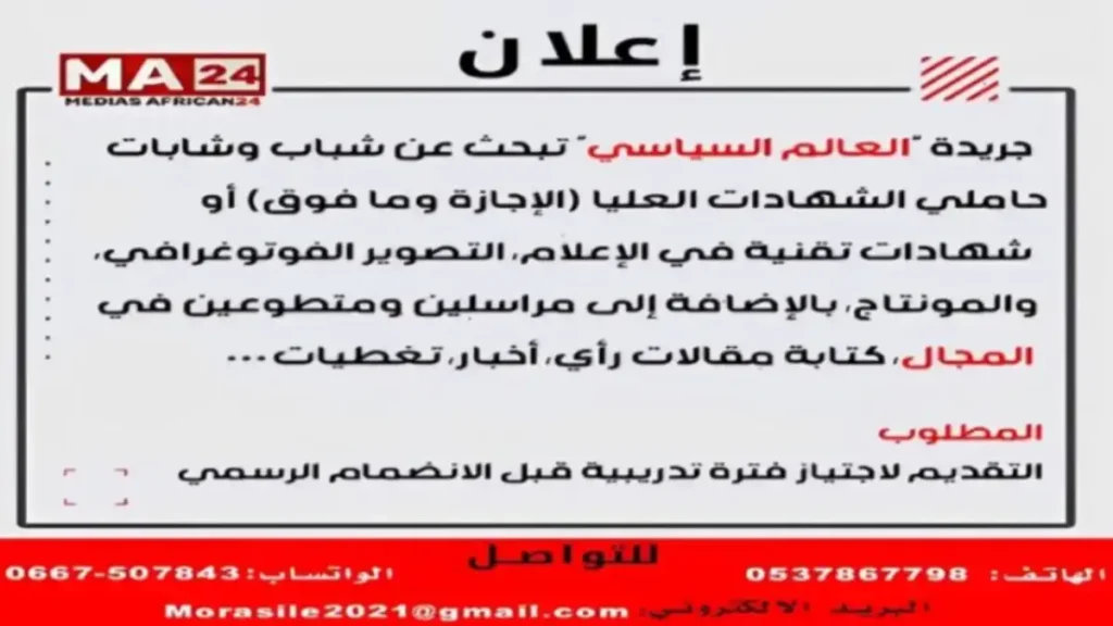 تعلن مؤسسة العالم السياسي عن فتح باب الانضمام إلى عالم الصحافة والإعلام. نحن نبحث عن: