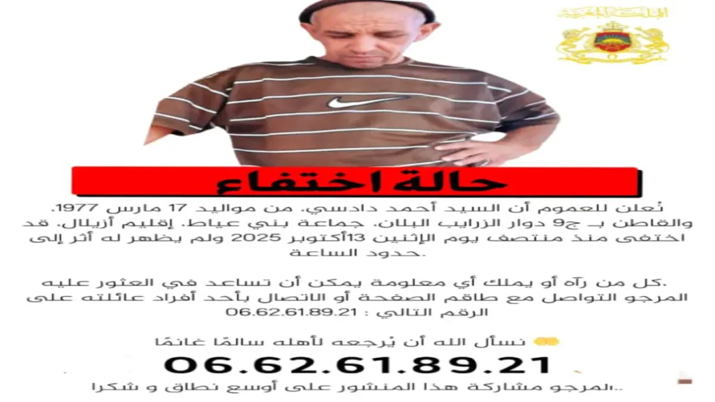 تعلن عائلة “دادسي”، عن اختفاء ابنها “أحمد”، من مواليد 17 مارس 1977. القاطن بــ”دوار الزرابيب اللبان”، “جماعة بني عياط” ب”إقليم أزيلال”. وذلك منذ منتصف يومه الإثنين 13 أكتوبر 2025، حيث لم يظهر له أي أثر لحدود الساعة.